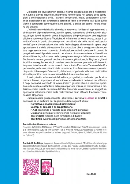 Il testo, rivolto ad operatori del settore, progettisti, coordinatori per la sicurezza e tecnici, si propone di coordinare le indicazioni derivanti dai differenti corpi normativi, cercando di fornire indirizzi giuridici chiari e istruzioni operative sulla scelta e sull’utilizzo delle più opportune misure di prevenzione e protezione contro i rischi di caduta dall’alto, fornendo, ovviamente, ai soggetti responsabili, istruzioni chiare sulla realizzazione di un efficace Elaborato Tecnico della Copertura.