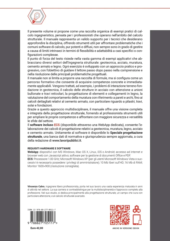 Il presente volume si propone come una raccolta organica di esempi pratici di calcolo ingegneristico, pensata per i professionisti che operano nell’ambito del calcolo strutturale. Il manuale rappresenta un valido supporto per i tecnici che desiderano approfondire la disciplina, offrendo strumenti utili per affrontare problematiche che i comuni software di calcolo, pur potenti e diffusi, non sempre sono in grado di gestire a causa di limiti intrinseci in termini di flessibilità e adattabilità a casi specifici o configurazioni complesse.